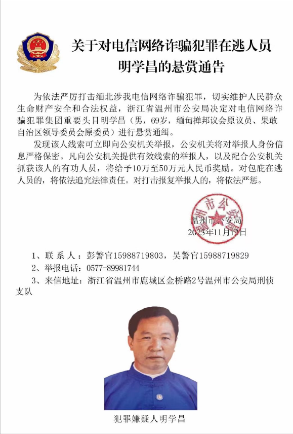 中国公安机关近期发布了一份悬赏通告,通缉四名涉电诈头目,其中以明学昌为首。该通告详细列举了这个犯罪集团的罪行,指出他们长期组织开设窝点,实施网络诈骗,并涉嫌严重暴力犯罪,造成严重后果。明学昌等人的犯罪活动涉及多个方面。