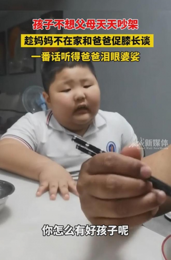 据视频里的父亲张先生称,最近和妻子吵架,妻子已经回家住一周了,吃饭前,儿子和自己聊天,希望以后不要和妈妈吵架。听了孩子的一番话,心里很愧疚。的确是,自己没有做好一个父亲,和妻子吵架,就是对孩子很不负责任的行为。