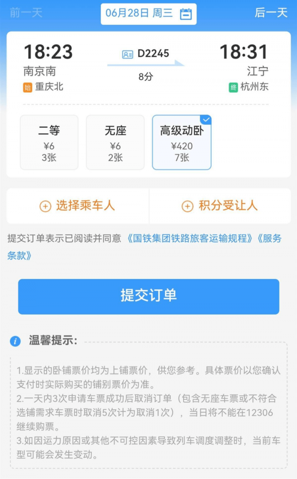 D2245次列车是从重庆北始发终至杭州东,南京南的下一站即是江宁。6月28日尚有7张余票,若无余票也可以提交候补订单。