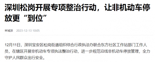 深圳市开展专项整治行动,让非机动车停放得更到位,在行动中,清理摆放共享单车59辆,暂扣乱停乱放的非机动车19辆,一边进行集中整治,以便对临时停车的驾驶人进行劝导,让车主正确停放到单车框架线内。