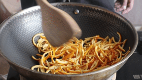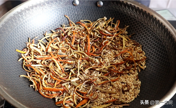 2.橘子皮和生姜不要一起下锅炒,因为橘皮的水分高于生姜,需要多炒一会才会炒干,如果同时下锅则会导致橘皮不够干或生姜过干。