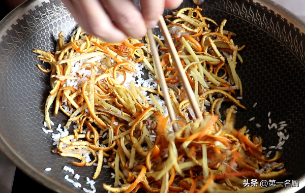 6、大概翻炒6分钟左右,就会发现橘皮的水分正在慢慢减少。接着把姜丝倒进去继续翻炒,炒至姜丝变软的时候,就可以把大米也下锅继续炒了。