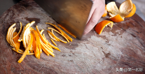 2、 咱们把橘子皮清洗干净之后,切成细丝状。