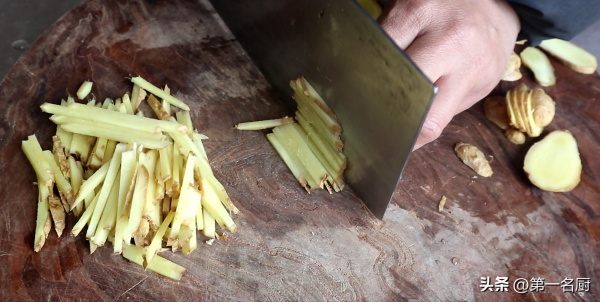 3、再找出一块生姜,抓点盐把外皮搓一下,再冲洗干净,也要切成细丝。(生姜不用去皮,能更好地保持生姜性温的特性)