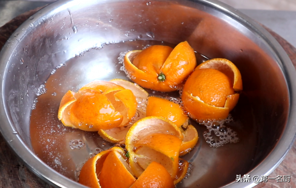 1、 找出几个外皮干净,稍微发黄的新鲜橘子,在顶部打上十字花刀,这样剥皮更方便。橘子皮剥下来之后,放入水碗中,加少许碱面(能更好地去除橘皮表面的农药残留),浸泡10分钟,再认真搓洗干净。