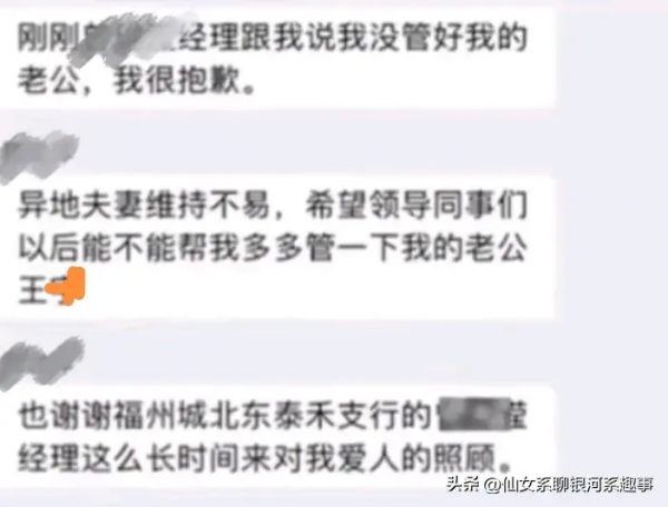 并且直言,请单位的领导和同志们多多的帮助自己的老公,并且也在群里面公开的感谢了银行的这位女经理,对她的老公这段长时间以来的贴心照顾。
