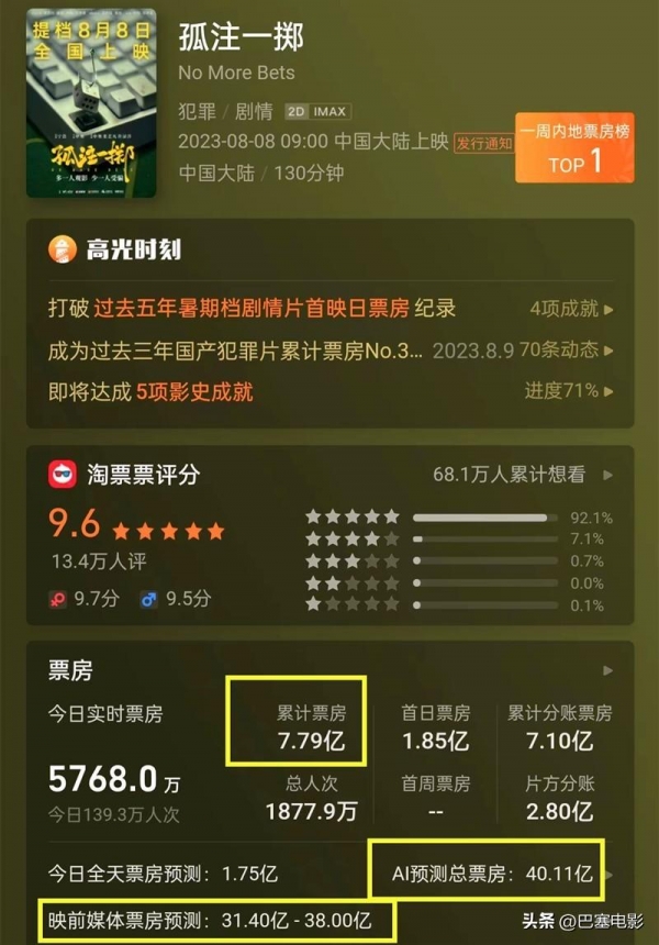 影片点映阶段便堪称好评如潮,提档上映后票房走势更是强劲。有媒体预测,总票房约31亿至38亿间。
