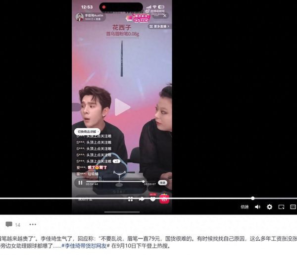 事情的起因是有网友在直播间吐槽花西子越来越贵了。李佳琦回怼:不要乱说,眉笔一直79,国货品牌很难的,我这几年一直看着花西子的,它贵不贵我最清楚了。有时候找找自己原因,这么多年了工资涨没涨?有没有认真工作?