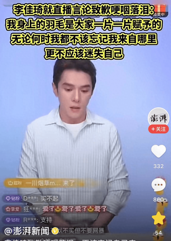 日前,李佳琦直播间因"言"翻车之后,微博粉丝不断往下掉,从昨天到目前,李佳琦已掉粉112万,这个掉粉速度在网红界几乎前所未有。目前李佳琦在直播间哭着向网友道歉,表示:"认识到了这种不恰当的表达是对他人的不尊重,是所有女生支持和信任让我走到了今天,我不该忘记自己来自哪里,不该迷失自己,对不起让大家失望了。"