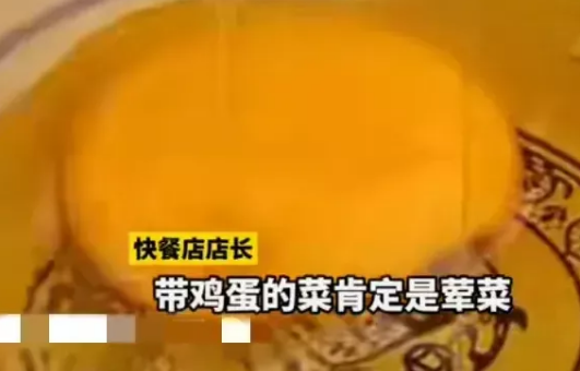 在记者实地采访的时候,快餐店的店长表示由于包菜炒肉,蒜薹炒肉丝等一些菜里面肉比较少,他们都算是素菜的,但是只要是带鸡蛋的都算是荤菜。