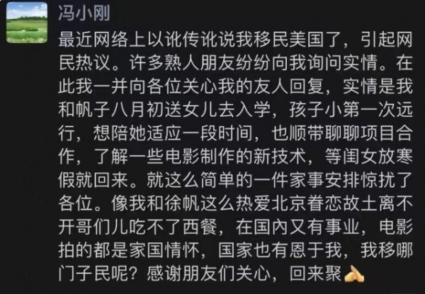 也正是因为夫妻俩到国外陪伴徐朵读书,引发了"移民"传言,搞得冯小刚赶紧出来澄清。