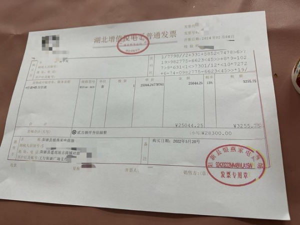 近日,湖北的刘女士向澎湃质量观投诉平台反映,2022年5月,她在湖北省黄石市阳新县银燕家电商场,为自己的新房购置了一台格力家用中央空调。刘女士说,2023年10月她才入住新房,然而2024年1月至今空调三次烧毁外机主板,维修人员多次上门维修。最近一次是在2月8日,维修人员来到她家中更换了空调外机主板和压缩机。