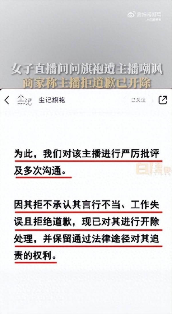 19日下午,尘记旗袍发文道歉,称已对该主播进行严厉批评,因其不承认言行不当、工作失误且拒绝道歉,已进行开除处理。