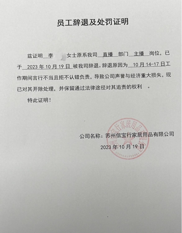 尘记旗袍官方账号还在评论区晒出员工辞退及处罚证明,表示已开除涉事女主播,并保留通过法律途径对其追责的权利。
