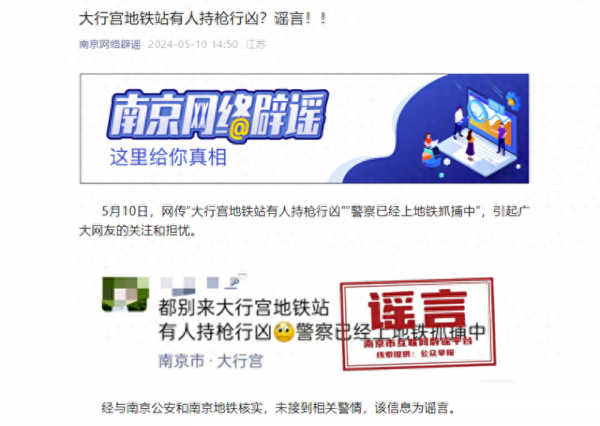 5月10日,有人在社交平台发布消息称"大行宫地铁站有人持枪行凶""警察已经上地铁抓捕中"等消息,引起广大网友的关注和担忧。据"南京网络辟谣"微信公众号,经与南京公安和南京地铁核实,未接到相关警情,该信息为谣言。