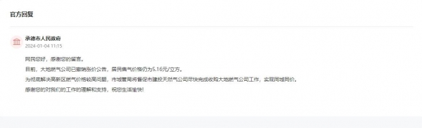 2024年1月4日,承德市人民政府回复称,目前,大地燃气公司已撤销涨价公告,居民售气价格仍为5.16元/立方。为彻底解决高新区燃气价格较高问题,市城管局将督促市建投天然气公司尽快完成收购大地燃气公司工作,实现同城同价。