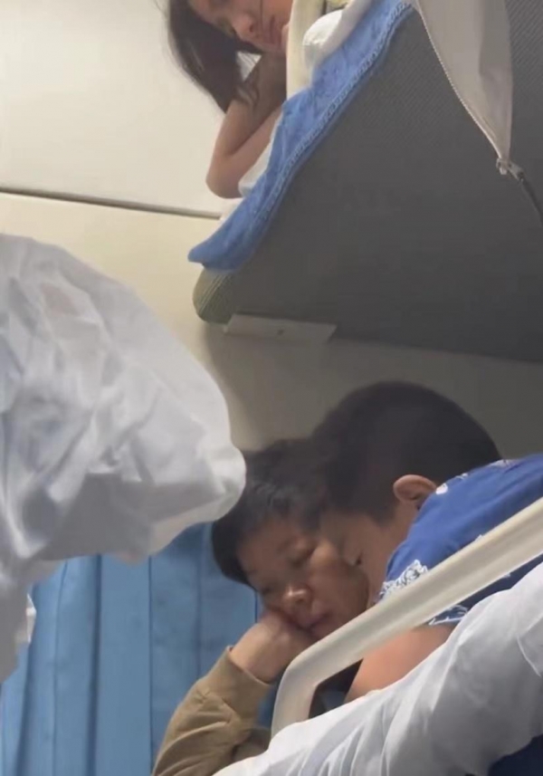 看中铺和上铺的乘客,他们三个应该是一家人,妈妈带着女儿和儿子一块出远门,不过,看着女孩睡在那么高的地方,还侧着身子探头往下看电影,感觉有些危险,如果是有恐高症的人,估计会觉着头晕。