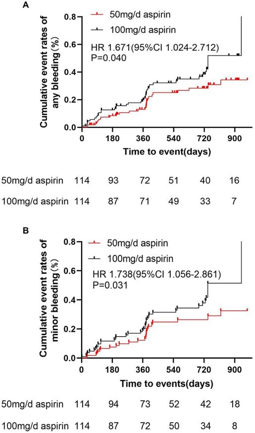 图1 接100mg/d与50mg/d阿司匹林治疗的老年患者的任何出血(A)和轻微出血(B)的累积事件发生率