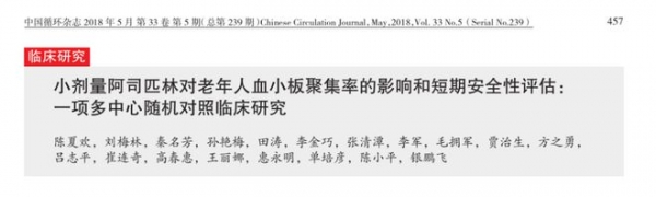 之前该团队进行的研究显示,老年患者服用阿司匹林50mg/d及100mg/d均可明显抑制花生四烯酸诱导的血小板聚集率,而肠溶缓释剂型较肠溶剂型降低了短期轻微出血及胃肠道不适等不良反应。