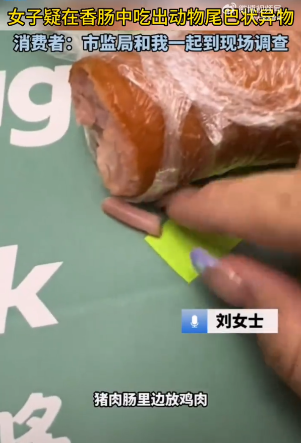 女子质疑道:"猪肉肠里面放鸡肉,放鸡肉怎么能把肠子放进去呢?"联系市场监管部门后,女子与市监局一同前往市场调查。