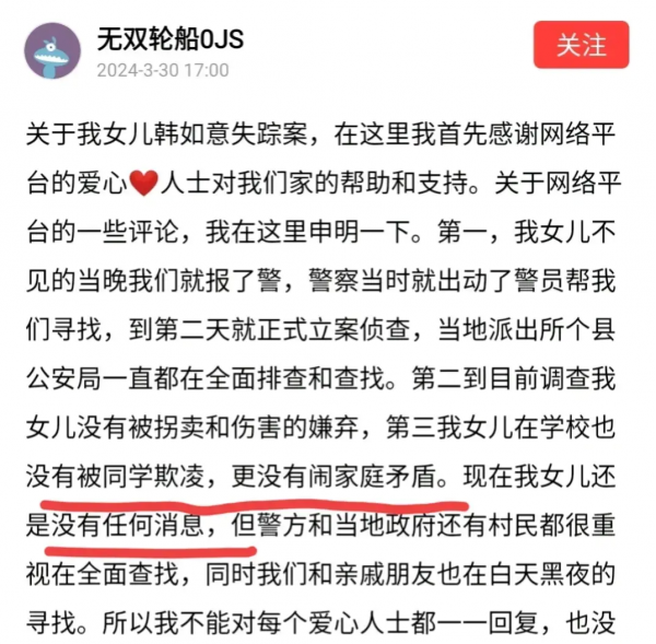 同时孩子父亲也表示,女儿是初一的学生,还是班长,失踪前很正常,没有和家人吵过架,他们也发动了亲戚朋友帮忙寻找,搜遍了周边的山洞、桥洞以及河道等地方,警方连警犬都出动了,但是仍然没有孩子的踪迹!
