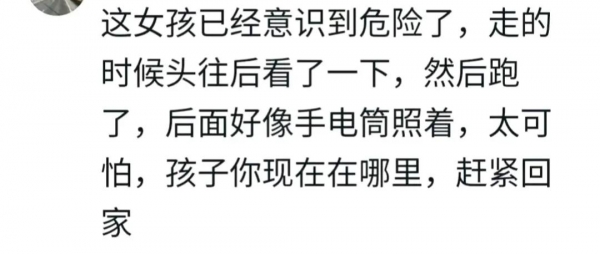有网友便表示,视频监控里面很明显有光斑照在衣服上,也就说明是有人在后面跟着她了,这个女孩似乎也意识到危险了,走的时候头往后看了一下,然后才突然跑起来的。