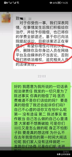 记者注意到网传的一段疑似涉事机构与张同学的微信对话内容,一方声称"对于你受伤一事,我们深表同情,在事情发生后,我们积极给你治疗,并给予你赔偿,也已将你的学费全部退还。基于你已向法院提起诉讼,目前该案正在审理中,希望你理性对待此次事件,删除你及你身边人员在网络平台及自媒体的不当言论,否则我们将依法维权,追究相关人员的法律责任。"