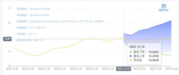 玄田算法是由项目课题组团队原创的非经典逻辑数值聚合理论和不确定性预测方法,构建了基于一致模算子的生猪价格预测模型。该模型采用的聚合函数及一致模相关理论与方法已获得多项国家自然科学基金和省级自然科学资金资助,并获得多项省级自然科学奖奖项。12月20日预测猪价为14.3569,置信区间在13.8757--14.8424之间。12月21日预测猪价为14.4636;12月22日预测猪价为14.3648。