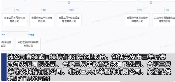 该公司直接或间接持有43家企业股份,包括六安市三羊开泰旅游发展有限公司、合肥三只羊教育科技有限公司、合肥三只羊助农科技有限公司、北京三只小羊服饰有限公司、安徽弘发物业有限公司等,版图涉及文化传媒、网络技术、电商、旅游、农业、食品、服饰等领域。
