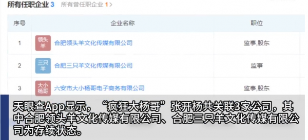 据天眼查App显示,"疯狂大杨哥"张开杨共关联3家公司,其中合肥领头羊文化传媒有限公司、合肥三只羊文化传媒有限公司为存续状态。"疯狂小杨哥"张庆杨关联6家公司,其中3家为存续状态,包括三只羊(合肥)控股集团有限公司、合肥三只羊网络科技有限公司、合肥领头羊文化传媒有限公司。