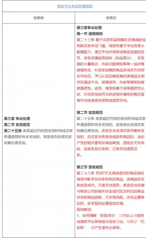 从调整过的新规来看,第一条为"新增淘宝基于平台自身大数据能力,识别多维度结合,对于买家发起符合相关情形的售后,做出快速退款或退货退款的规则依据"。