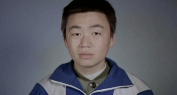 他穿着蓝色的运动服,显得稚嫩生涩。