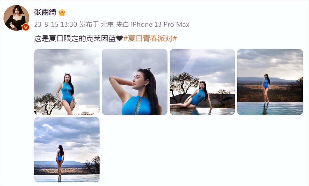 8月15日下午,演员张雨绮在个人社交平台分享了一组出游美照,这次她罕见穿上泳装出镜,惊艳众人。张雨绮还发文写道:"这是夏日限定的克莱因蓝"。张雨绮一直都是娱乐圈里公认的高颜值、好身材的完美女神,不过平时她极少穿泳装出镜,此番她罕见且大方穿上泳装秀出火辣身材,确实是给足大家惊喜了。