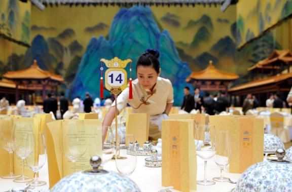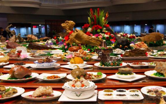 4.中国国宴。我们的国宴也非常的张扬和正式。菜品一共108道菜品,包括八大菜系和其他经典小吃,整齐地摆放在长桌上,其中狮子头、佛跳墙、三宝鸭菜是主要的代表菜系。不仅各种菜品的制作很有讲究,陈列的位置也很讲究。每一道菜都蕴含着优秀的中华文化,向外宾展示中华文化的独特魅力。