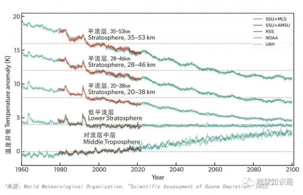 而当臭氧损耗后,更多的紫外辐射直接穿透了平流层,导致平流层的温度下降。