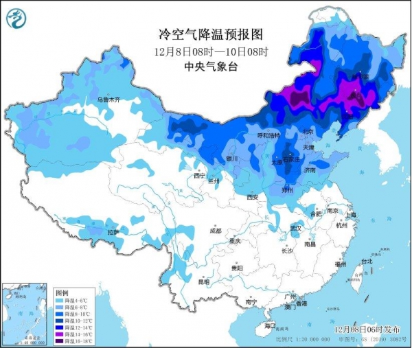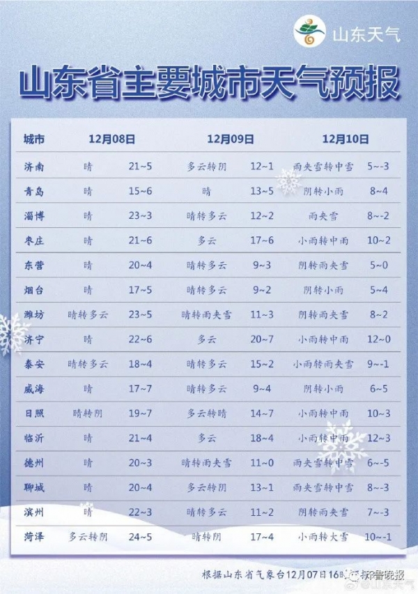 山东省气象台于12月7日17时发布寒潮蓝色预警,强冷空气即将来袭,9~11号山东将出现寒潮雨雪天气,最低气温将下降8℃以上,局部地区降温幅度达16℃以上。大风天气也将持续,请大家注意添衣保暖,做好防风防寒准备。