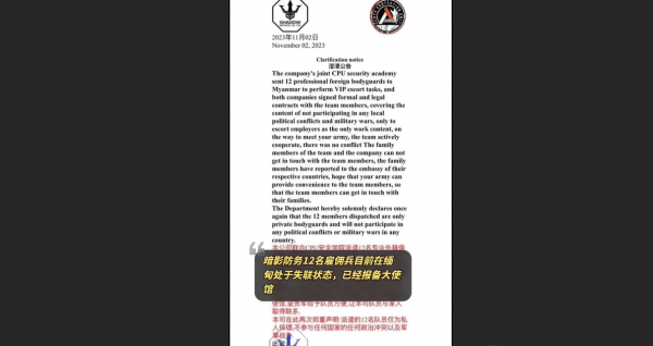 前线战局不利也让留守在果敢的"四大家族"动起了歪心思。近期社交媒体上流传的一份疑似美国"暗影防务"公司发布的声明,隶属于该公司的12名外籍"安保人员"在缅甸执行保护雇主任务时失联,他们无意介入缅甸政治和军事局势,希望各方力量能高抬贵手。