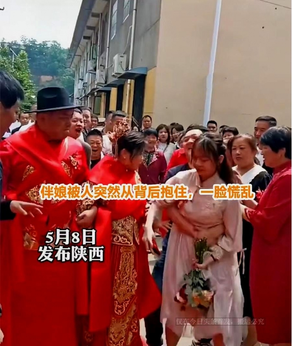 新娘和周围的人纷纷望向伴娘,面对这突如其来的举动,新娘和伴娘都有些意外。而后送亲的队伍中的人看到这一幕却并不陌生,他们笑得前俯后仰,仿佛在看一场精彩的喜剧。