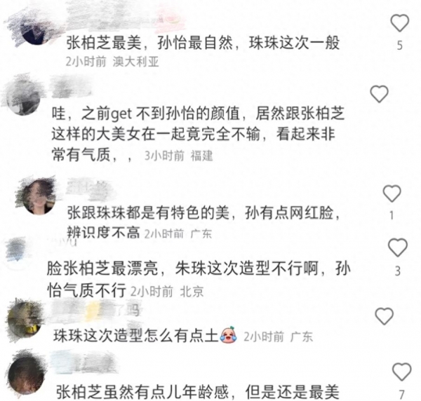 这三位美丽的女星难得地同框一起,给大家呈现了一场视觉盛宴。网友们也纷纷发表评论,对她们的美貌表达了赞叹之情,同时也对朱珠的造型提出了一些吐槽。