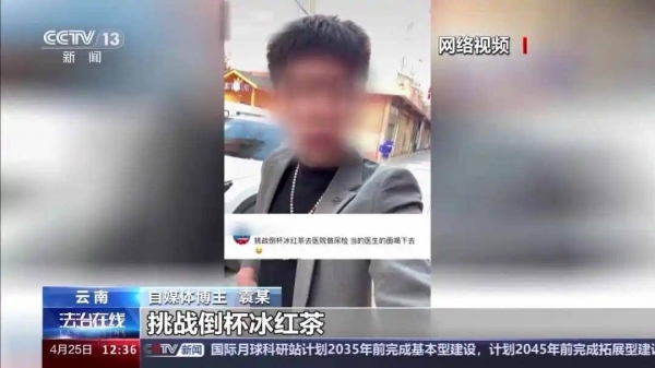 这是一名袁姓短视频博主上传至网络的一段视频。原本以为只是为了视频效果,但令人没有想到的是,袁某竟真的跑到了当地一家医院接受了这个荒唐的挑战。