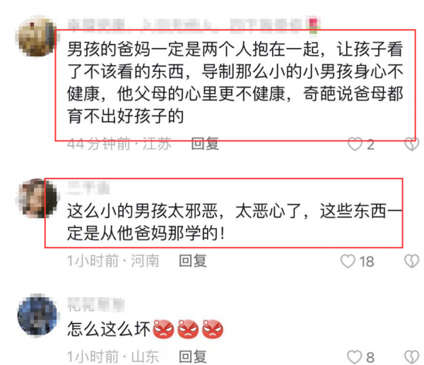 除了这些,有网友还指责这个儿童的父母,说孩子这么小就懂这些,肯定是在家里,爸妈抱一起的时候,让孩子看到了一些不该看的东西,导致小男孩身心不健康,可见孩子的父母身心也有问题。