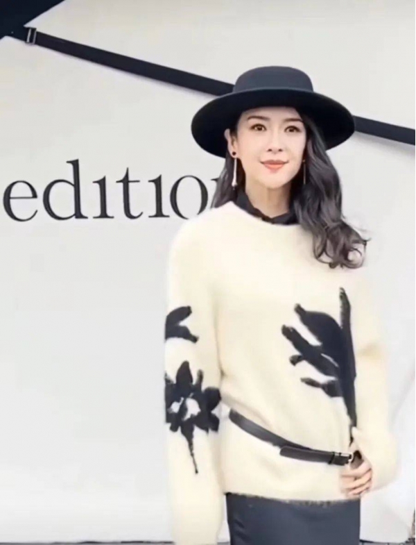 如图,当天,章子怡头戴黑色帽子,身穿白色毛衣,搭配黑色长裙,长发微卷,造型上时髦又洋气。