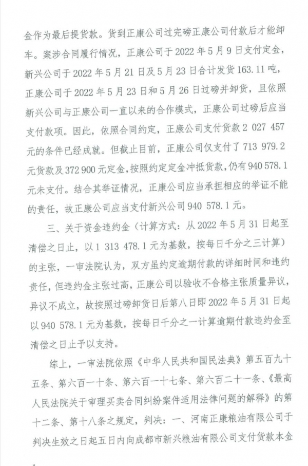 2022年10月11日,邛崃法院作出判决:被告正康公司向原告成都市新兴粮油公司支付货款本金94万余元及逾期付款违约金。