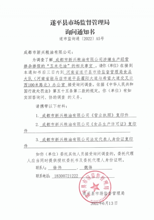 2022年7月15日,遂平县公安局函件称,接到移交关于成都市新兴粮油公司"涉嫌生产、销售伪劣产品"的案件,要求派负责生产该批涉案玉米毛油(压榨)的负责人前往遂平县配合调查,并提供相关证据材料。