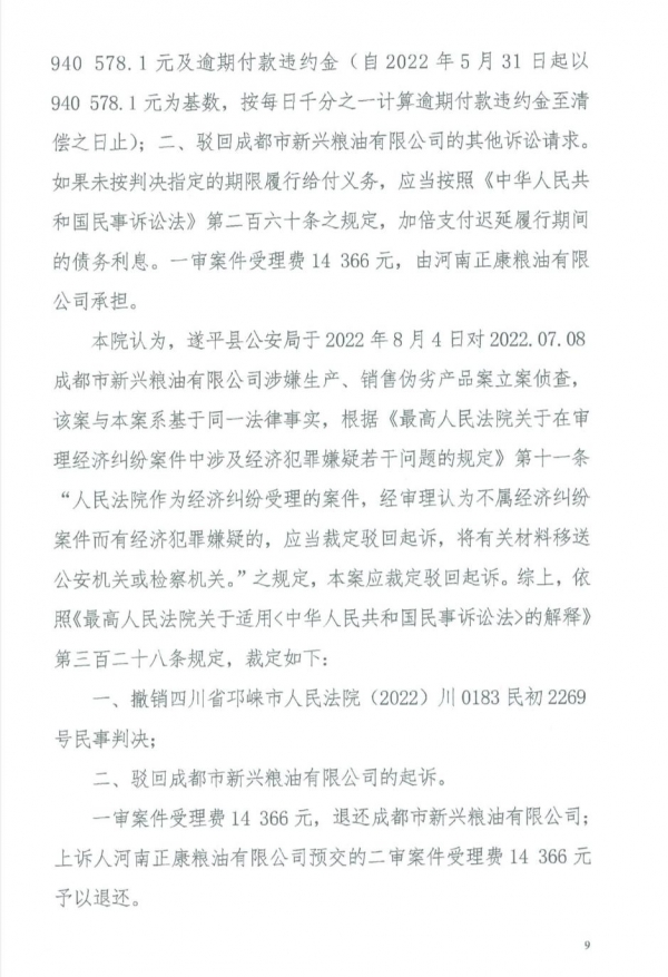 一审判决后,正康公司不服,随后向成都中院提起上诉。2023年8月9日,成都市中级人民法院作出二审裁定认为: 遂平县公安局于2022年8月4日对2022.07.08成都市新兴粮油公司有限公司涉嫌生产、销售伪劣产品案立案侦查,该案与本案系基于同一法律事实,根据《最高人民法院关于在审理经济纠纷案件中涉及经济犯罪嫌疑若干问题的规定》第十一条"人民法院作为经济纠纷受理的案件,经审理认为不属经济纠纷案件而有经济犯罪嫌疑的,应当裁定驳回起诉,将有关 材料移送公安机关或检察机关。"之规定,本案应裁定驳回起诉。综上,依照《最高人民法院关于适用< 中华人民共和国民事诉讼法>的解释》第三百二十八条规定,裁定如下: