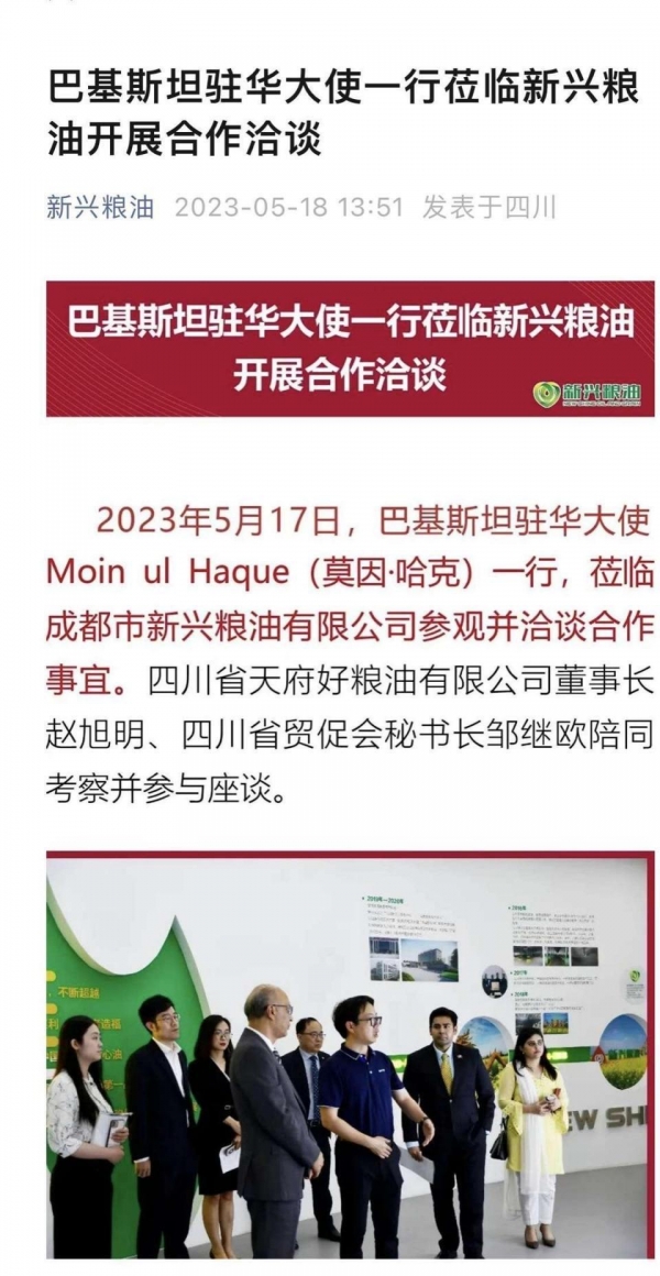 看到询问通知书,成都市新兴粮油公司有限公司才得知收不到货款的原因。该公司相关负责人称,作为一家经营了三十多年的老牌粮油企业,不可能自毁口碑,在油品里掺假,而且玉米毛油和棉籽油的价格差不多,并无掺假动机。企业经营几十年,获得了众多荣誉和不错的口碑。如果产品掺假,无异于是自寻死路。正是因为成都市新兴粮油公司在油脂行业的影响力,2023年5月17日,巴基斯坦驻华大使一行还来到成都市新兴粮油公司参观并洽谈合作事宜。