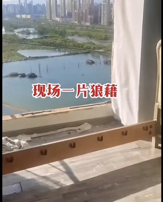 现场画面显示,两人所住卧室的落地窗已经不见了,直接可以看到房子下面的湖水,而床只剩下一个空架子和床头板,床垫和床板不翼而飞,现场一片狼藉。