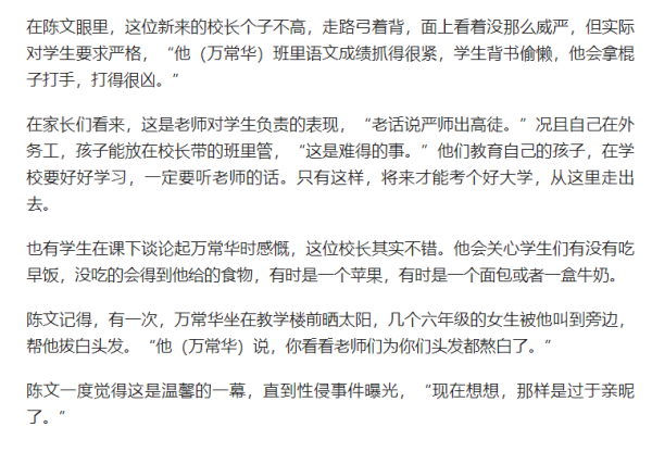 这所小学的老师陈文说到:一直以为万常华是一个严厉的老师,常常会叫学生去背书,背不出来就打,打得很凶!在陈文眼里这俨然一副"严师出高徒"的样子。也见过万常华叫女生去给他拔白头发,一度以为这是温馨的场面,直到性侵事件曝光。