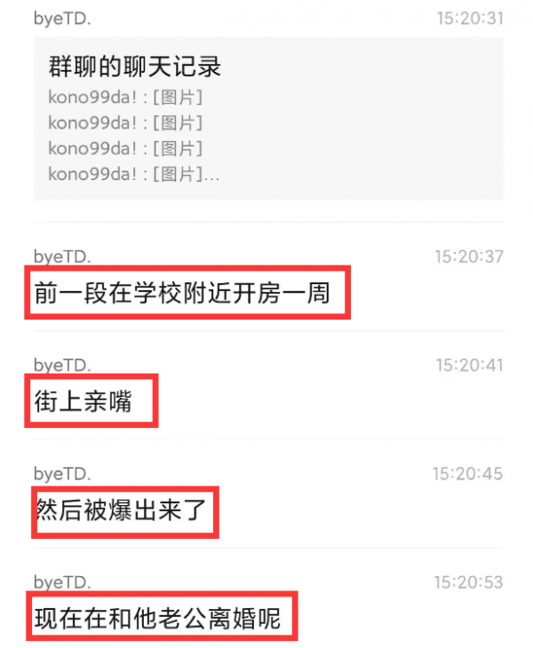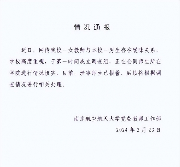 3月23日,网络上铺天盖地传出几张群聊截图,内容显示南航女教授与本校一大四学生发生关系,两人开房一周,还一起去海南旅游,女教授为了和男生在一起,不惜放弃家庭选择和老公离婚。