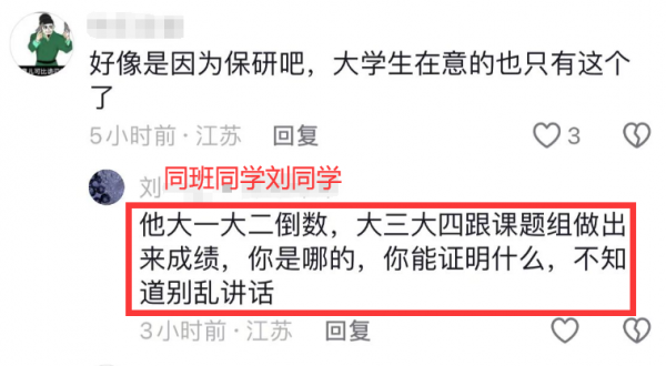 此事被热议后,同学也发声了,网友说,这个郑同学是因为保研和女教授在一起,同学回应说,他大一大二倒数,大三大四跟着课题组做出来的成绩,不知道别乱讲话。